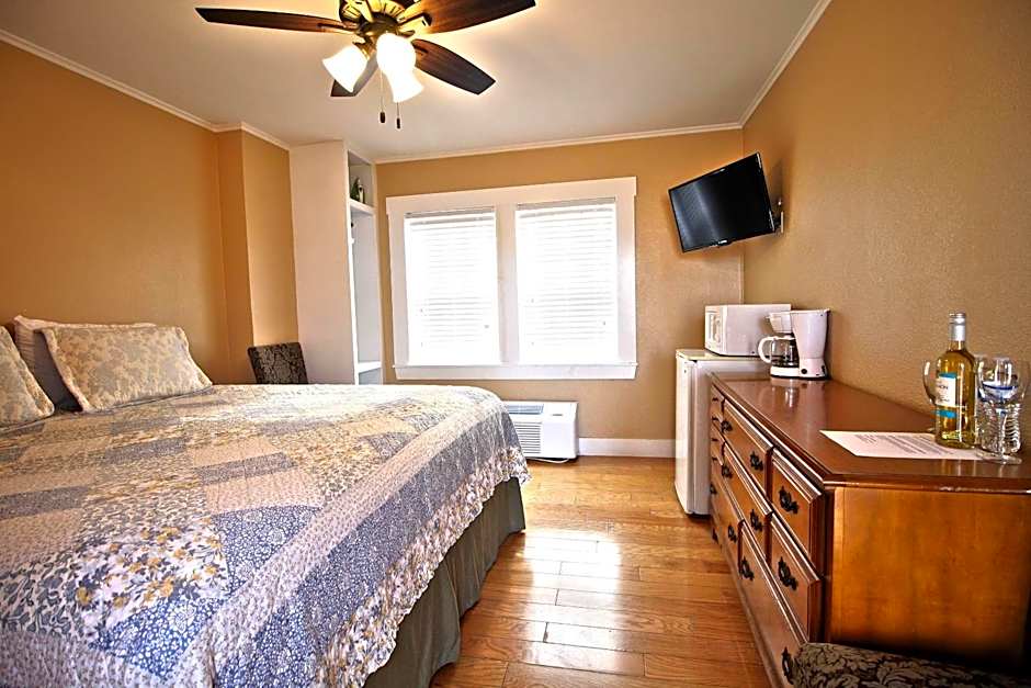 A seating area with a sofa bed and a cable TV is featured in this room. A refrigerator and a microwave are also included.